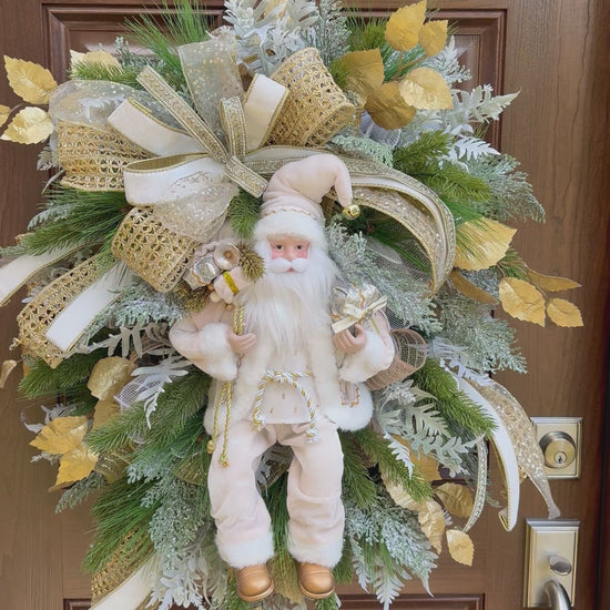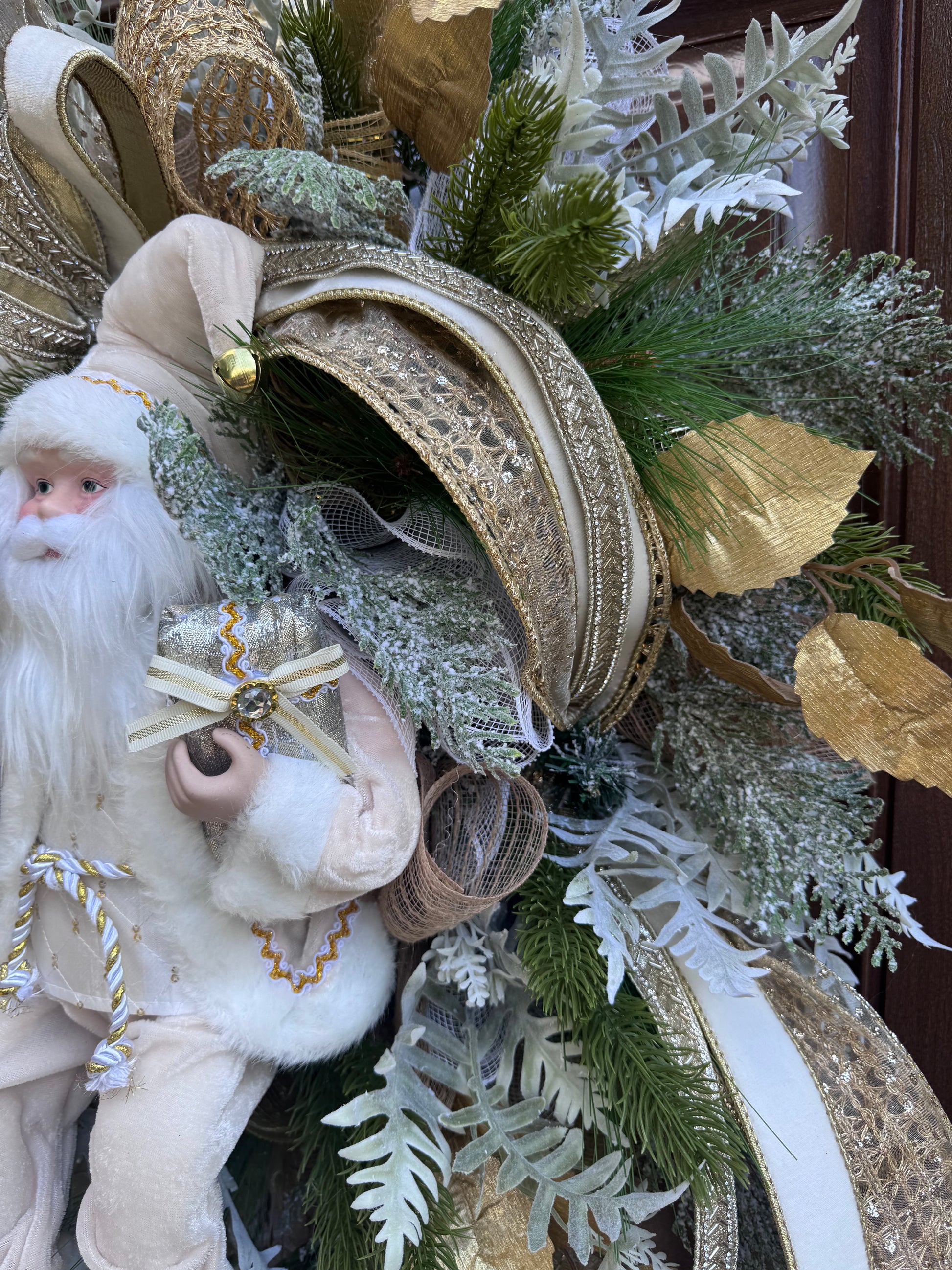 Elegant Santa Christmas Swag Wreath – White & Gold Holiday Door Decor