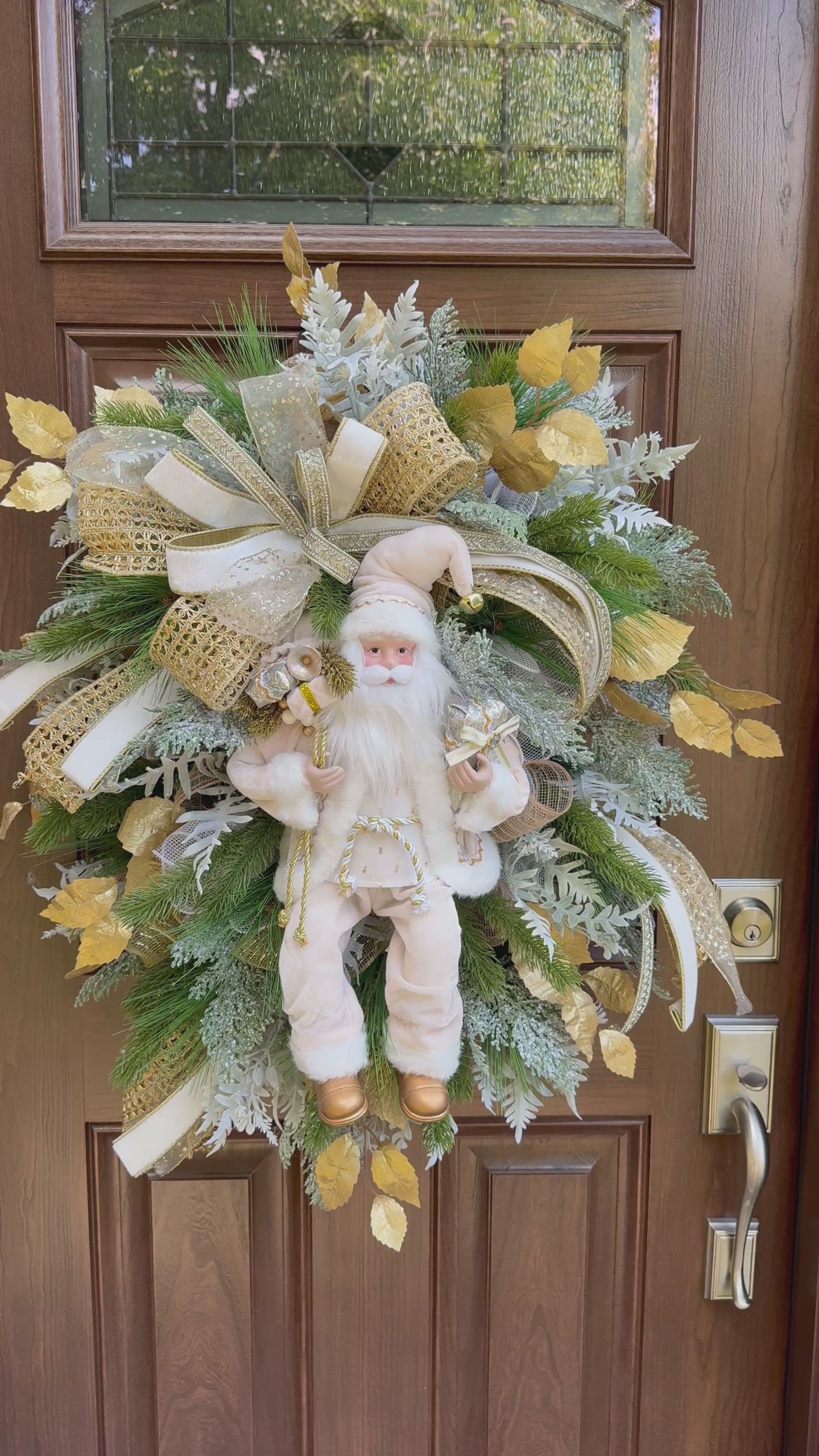 Bring the magic of Christmas to your home with this one-of-a-kind elegant Victorian Santa Christmas wreath. This show-stopping design features a soft and elegant white and gold color palette, complete with shimmering gold leaves, frosted greenery, luxurious layered bows, and a plush Santa Claus centerpiece holding tiny gifts. Perfect for adding timeless holiday charm to your front door, entryway, or fireplace mantel, this piece instantly creates a festive, welcoming atmosphere.